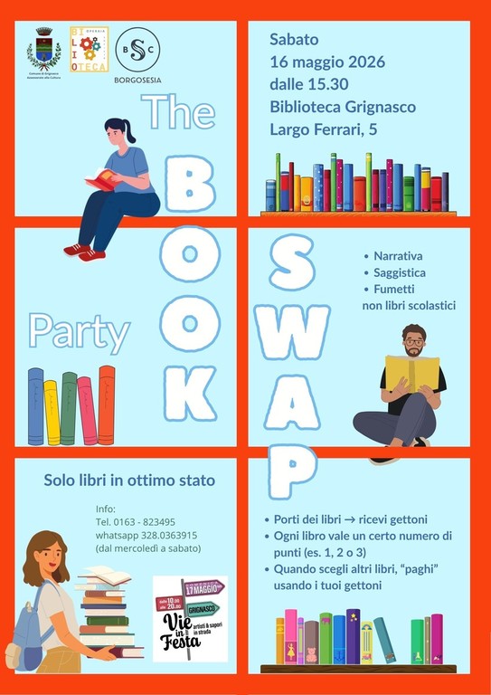 Per informazioni sul Book Swap è possibile contattare il numero 0163 823495 oppure inviare un messaggio WhatsApp al 328 0363915, dal mercoledì al sabato.
