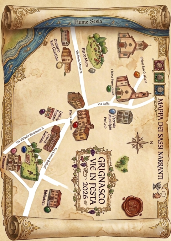 La mappa dei sassi narranti guiderà i partecipanti tra diversi punti di Grignasco. Tra i luoghi indicati compaiono la zona del Fiume Sesia, l’Oratorio San Giustino, il Parco Mora, la Chiesa Parrocchiale, la Chiesa di San Graziano, il Vecchio Municipio-Pro Loco, piazza Cacciami, l’Ufficio postale, il Comune, l’installazione Icona Incanto e la Biblioteca.