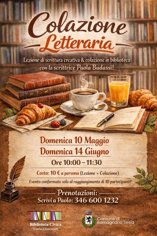 Domenica 10 maggio, dalle 10 alle 11.30, la biblioteca ospiterà “Colazione letteraria”, una lezione di scrittura creativa accompagnata dalla colazione, con la scrittrice Paola Budassi.