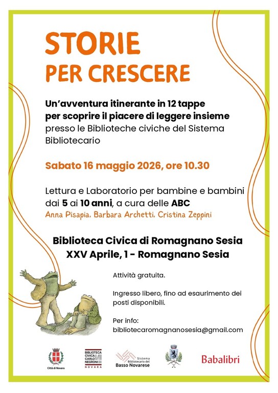 Sabato 16 maggio alle 10.30 la Biblioteca civica di Romagnano Sesia ospiterà “Storie per crescere”, un’avventura itinerante in 12 tappe per scoprire il piacere di leggere insieme nelle biblioteche civiche del Sistema Bibliotecario.